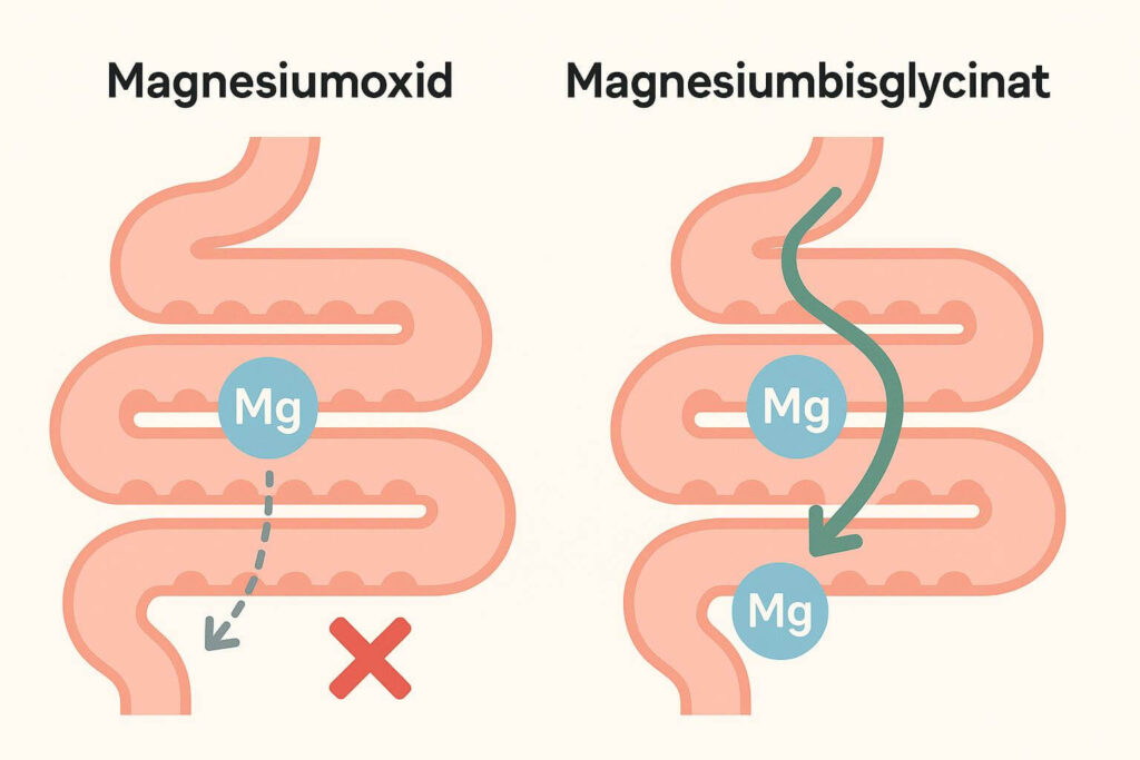 Die Antwort ist einfach: Magnesium ist nicht gleich Magnesium. Die Wahl der Verbindung macht den Unterschied. Während viele Produkte auf billiges Magnesiumoxid setzen, die kaum bioverfügbar sind, braucht der Körper vor allem eins: eine Verbindung, die er möglichst verlustfrei aufnehmen kann.